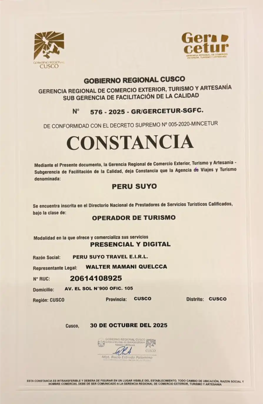 Somos una agencia de viajes localizada en el corazón del Imperio Inca: Cusco, Perú. En Peru Suyo Travel, nuestro objetivo es ofrecer experiencias auténticas, personalizadas y memorables para cada viajero que desee descubrir la riqueza cultural, histórica y natural del Perú.